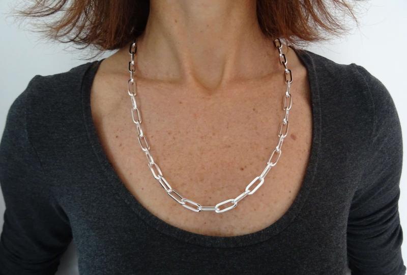 Le maglie sono di forma allungata, la sezione del filo e' quadrata. E' la versione media delle catene a maglia allungata con filo quadrato.