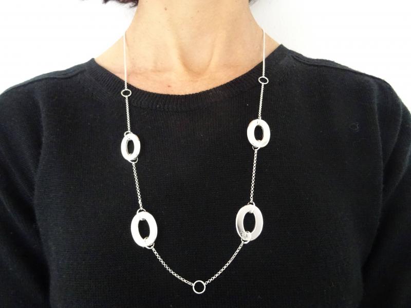 Collana in argento 925 con piccola catenina rolo tondo intervallata da maglie ovali piatte vuote (larghezza 17mm, lunghezza 22mm, spessore 3mm).