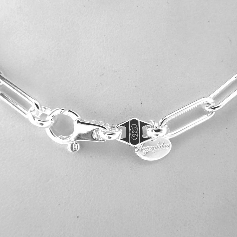 Catena a maglia paperclip allungata, le singole maglie hanno una larghezza di 5,2mm ed una lunghezza di 13,8mm.