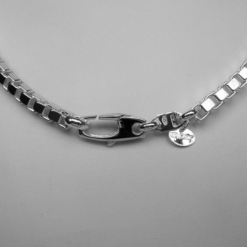 La collana e' del colore naturale dell'argento, lucidata manualmente a specchio, su richiesta del cliente puo' essere rodiata.